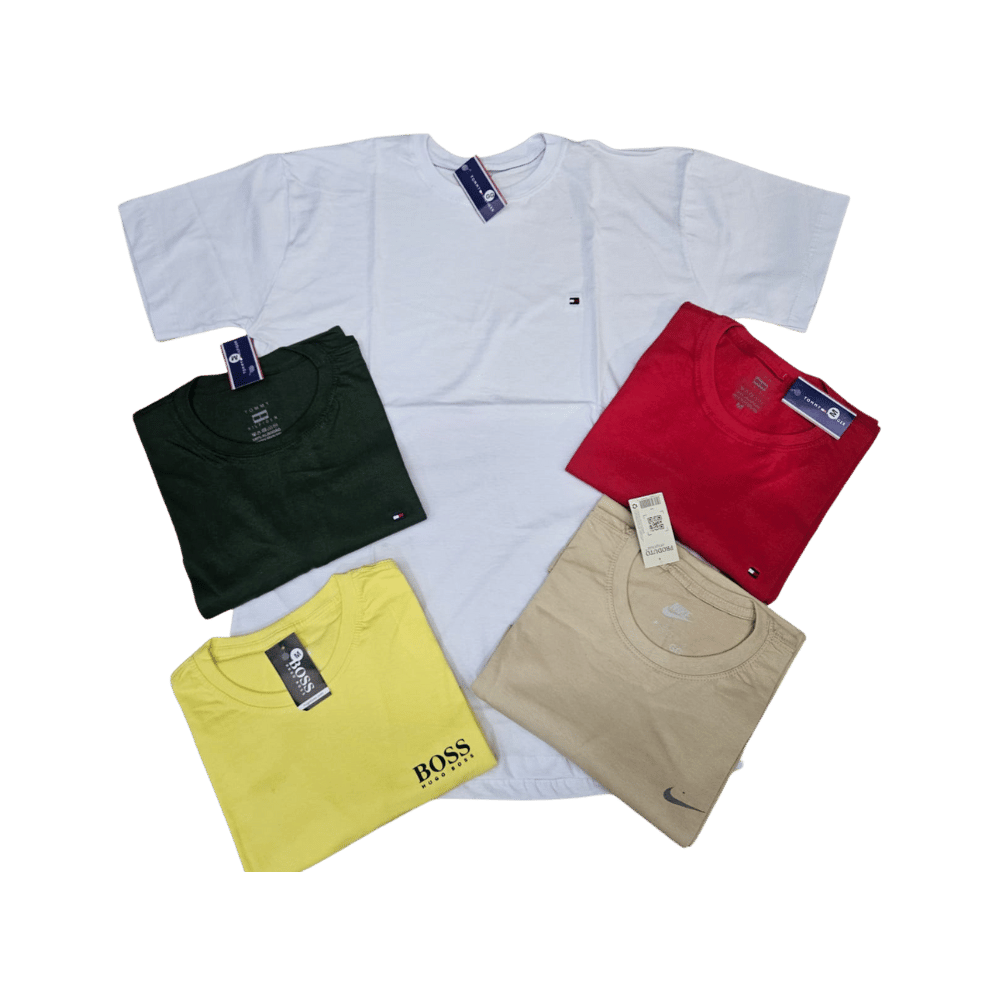 O combo contém 5 camisetas com cores já definidas, conforme exibido nas imagens, todas produzidas em 100% algodão.